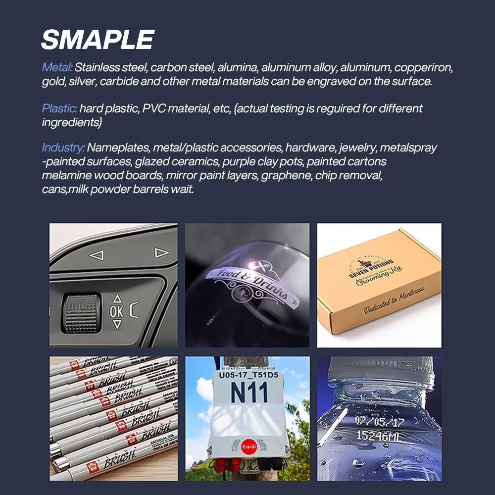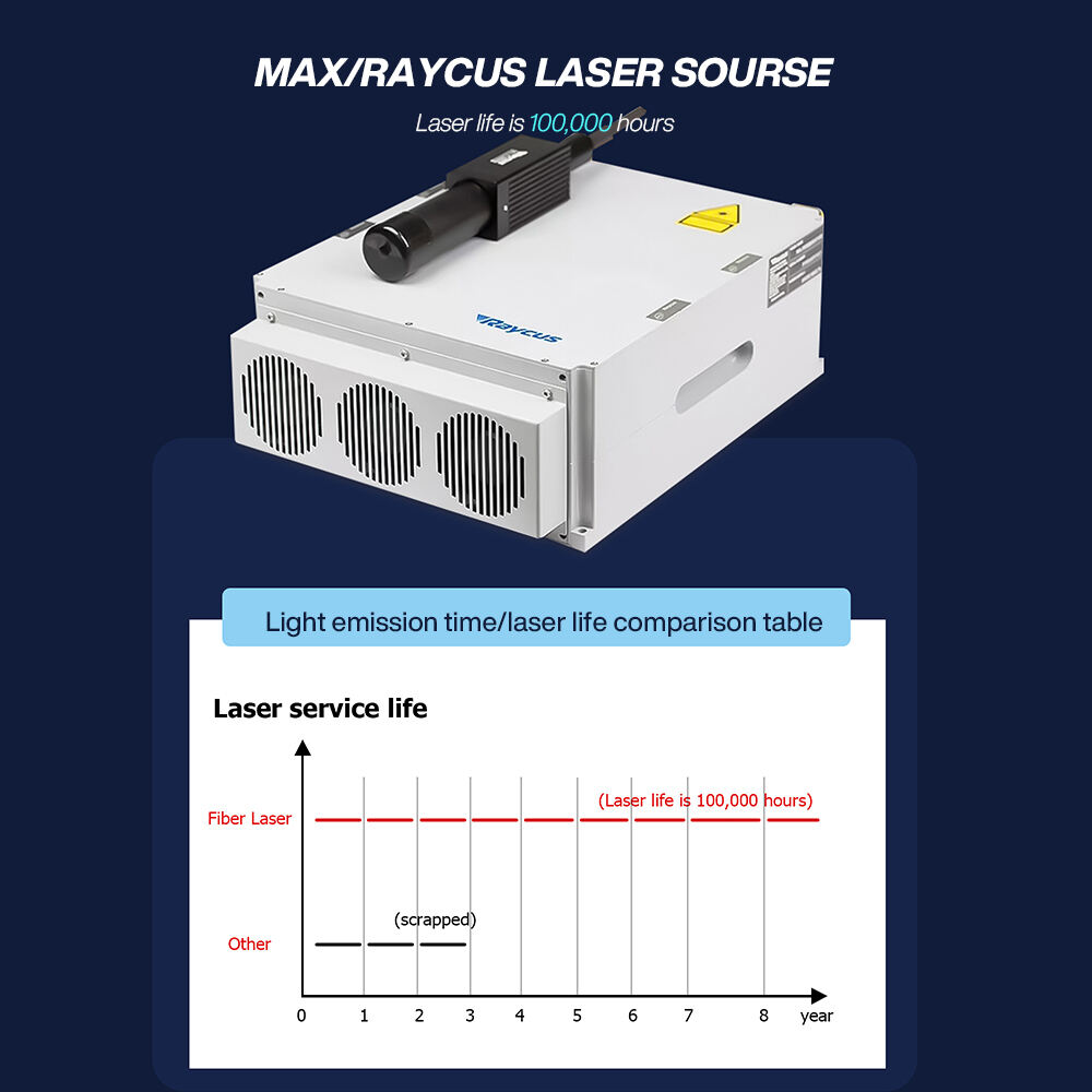 La sorgente ha una durata stimata fino a 100.000 ore, a seconda delle impostazioni di utilizzo della potenza ed è in grado di marcare in sicurezza la maggior parte dei metalli, come acciaio inossidabile, oro, argento e ottone. Classe laser: Classe 4, Potenza in uscita: 50000mW.