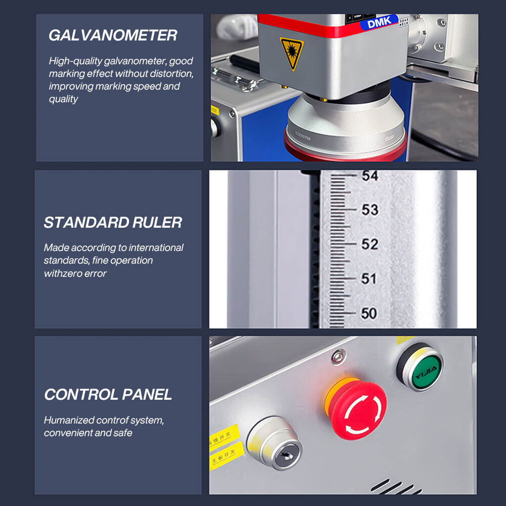 Abbiamo aggiunto due ventole di raffreddamento al laser a fibra per aiutarlo a dissipare meglio il calore e la macchina integra un alimentatore per rendere il laser a fibra più stabile. Abbiamo combinato i tre pulsanti di accensione originali in uno solo e aggiunto un pulsante di emergenza