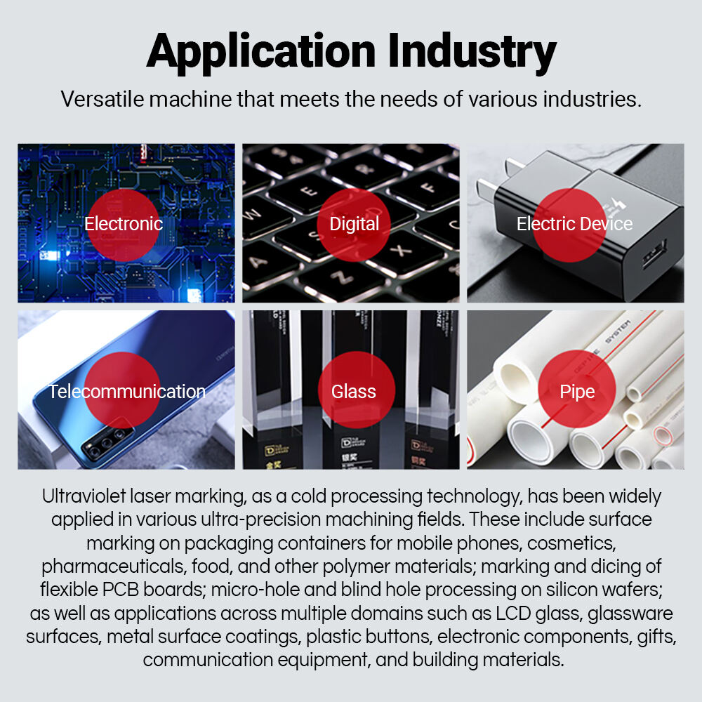 Dotato di un sistema di raffreddamento a liquido (precisione del controllo della temperatura ±0,3 ℃) per garantire un funzionamento stabile a lungo termine dell'equipaggiamento, è ampiamente utilizzato in scenari di marcatura ultrafine di alta gamma come confezionamento cosmetico, confezionamento medico, confezionamento alimentare, marcatura e dicing di PCB flessibili, lavorazione di wafer di silicio, marcatura di codici QR su vetro LCD cristallo liquido, componenti elettronici e apparecchiature di telecomunicazione.