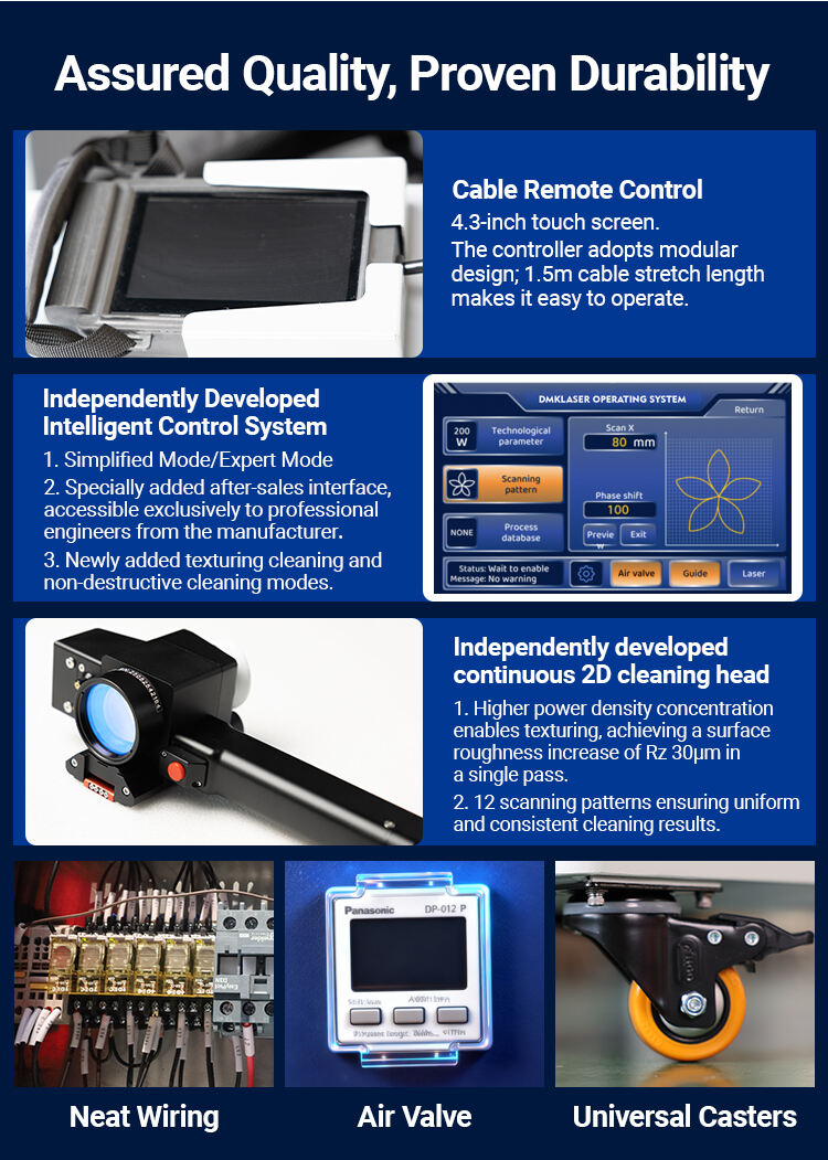 The laser cleaning equipment is a new type of industrial cleaning device. It adopts peak power pulse laser, high-speed scanning system and high-precision control system. The internal electrical components are selected from well-known enterprise brands, featuring stable and reliable performance, excellent quality, super portability, high efficiency and cost-effectiveness.