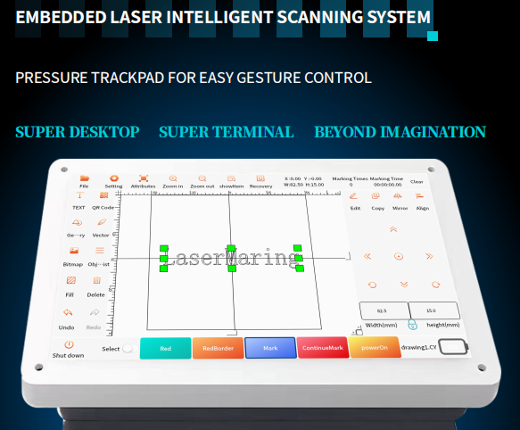 | พารามิเตอร์การปฏิบัติงานและการจัดเก็บ | - อินเทอร์เฟซการใช้งาน: หน้าจอสัมผัสขนาด 7 นิ้ว, ระบบปฏิบัติการ Linux - โหมดการระบุตำแหน่ง: การระบุตำแหน่งด้วยแสงสีแดง - รูปแบบไฟล์ที่รองรับ: PNG, JPG, BMP, DXF, PLT, SVG - ประเภทบาร์โค้ด/QR Code ที่รองรับ: CODE25, CODE39, QRCode เป็นต้น - ภาษาที่รองรับ: ภาษาจีนตัวย่อ, ภาษาอังกฤษ, ภาษาเกาหลี, ภาษาเยอรมัน, เลขอาหรับ เป็นต้น |