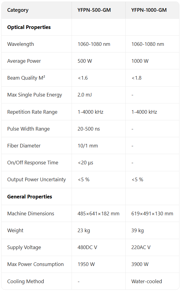 - Geniş Ayarlanabilir Parametreler : Tekrarlama frekansı aralığı 1-4000kHz ve YFPN-500-GM'nin darbe genişliği 20-500ns arasındadır; bu da farklı malzeme işleme gereksinimlerine esnek şekilde uyum sağlamayı mümkün kılar.
